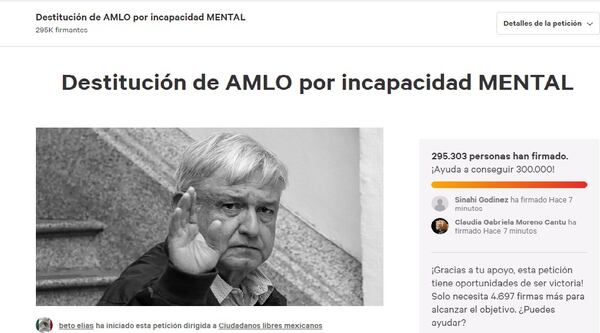 “Los invitamos a votar, para que AMLO sea destituido a la brevedad, pues es imposible que una persona que sufre evidentemente de sus facultades mentales, gobierne un país”, señala la petición que hasta ahora ha sido firmada por más de 400,000 personas.